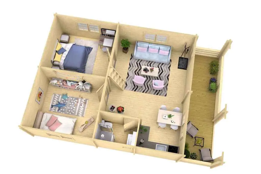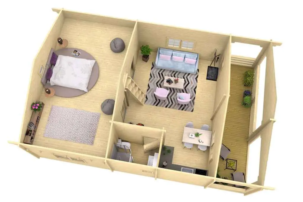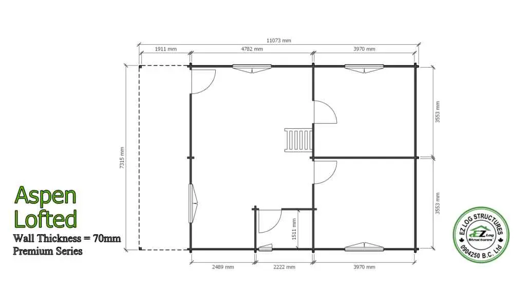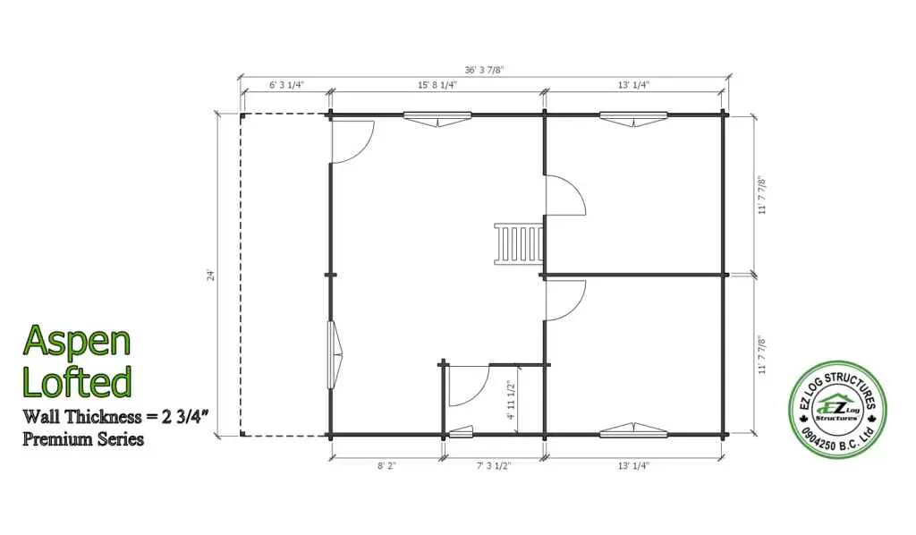 The Aspen is a compact 2 bedroom home with a large loft area. The sidewall height is 95″ to the underside of the loft floor beams providing plenty of ceiling height in the bedrooms. The loft has 36″ sidewalls that create a higher loft area. The balance of the house has vaulted/cathedral ceilings throughout. (sq footage is based the total footprint, living space could be less, see floor plans)