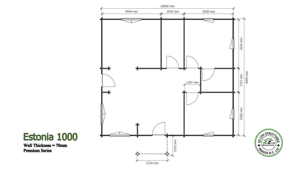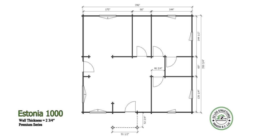 The Estonia 1000 is an open concept 3 bedroom, 2 bath home with vaulted ceilings throughout. It has solid stacked walls using 70mm (2-3/4″) thick logs. An affordable starter home that is extremely energy efficient. Like all our models it can be customized to fit your personal needs. (sq footage is based the total footprint, living space could be less, see floor plans)