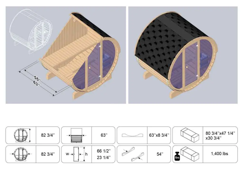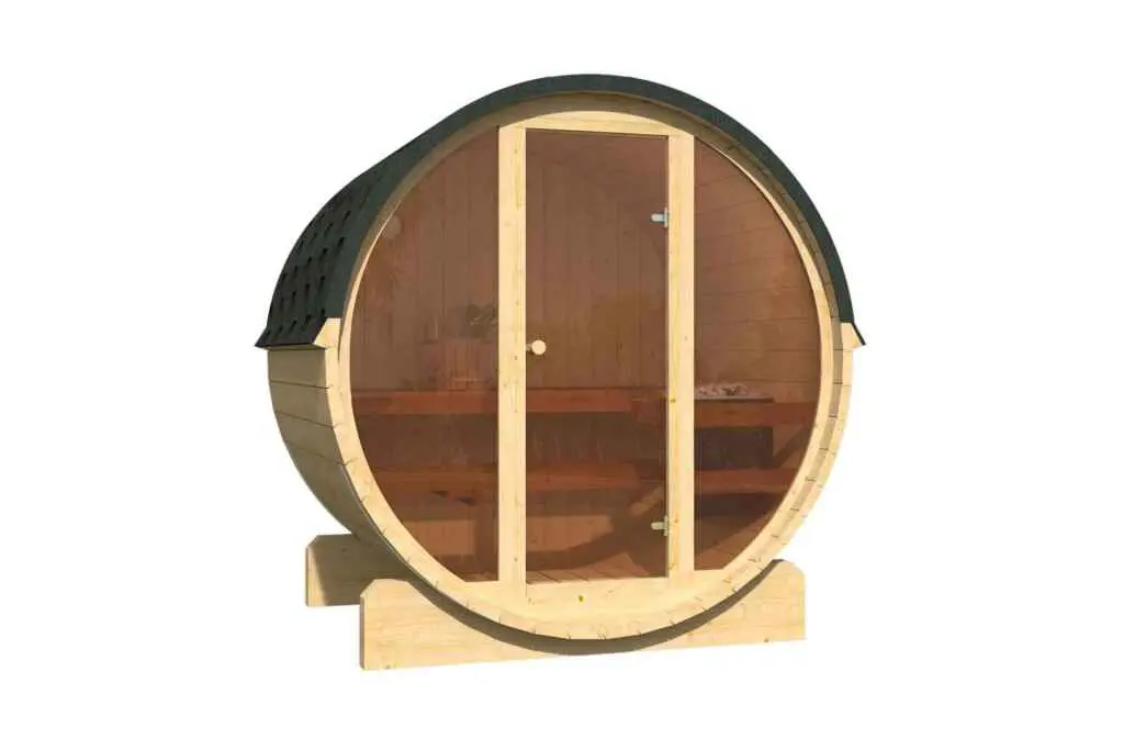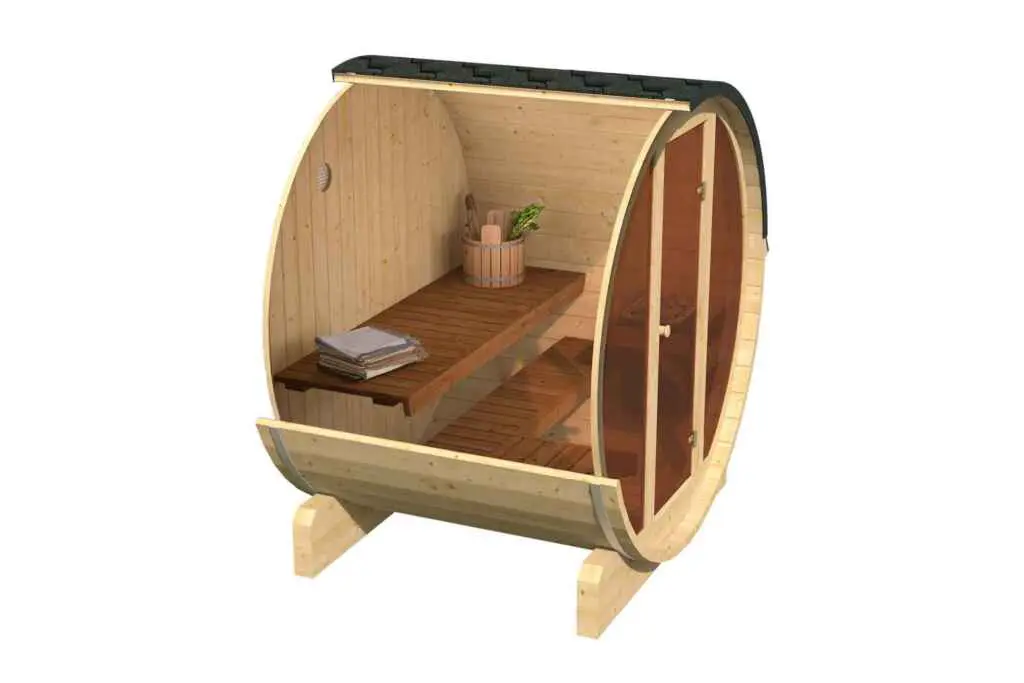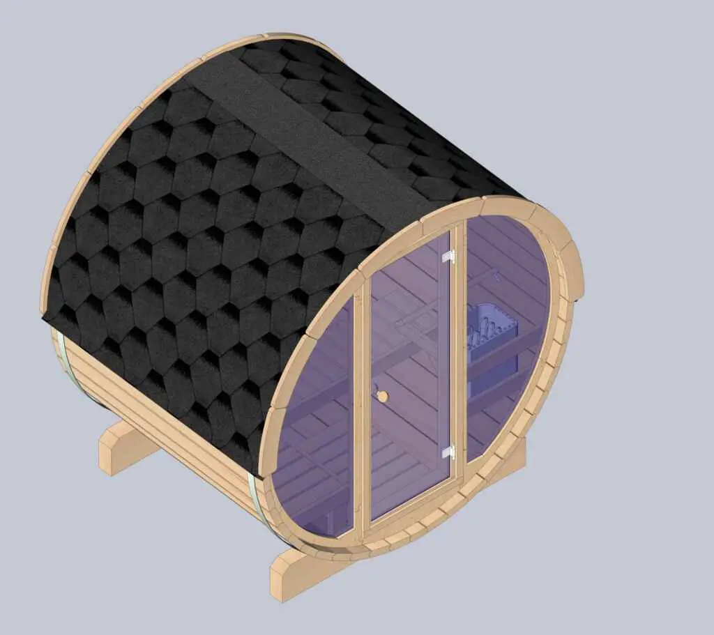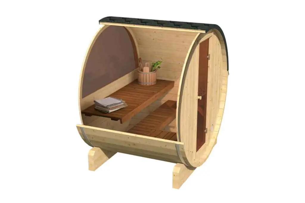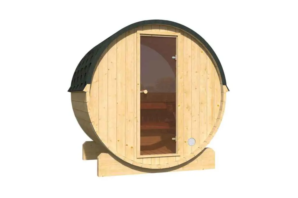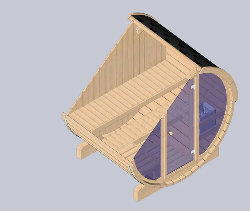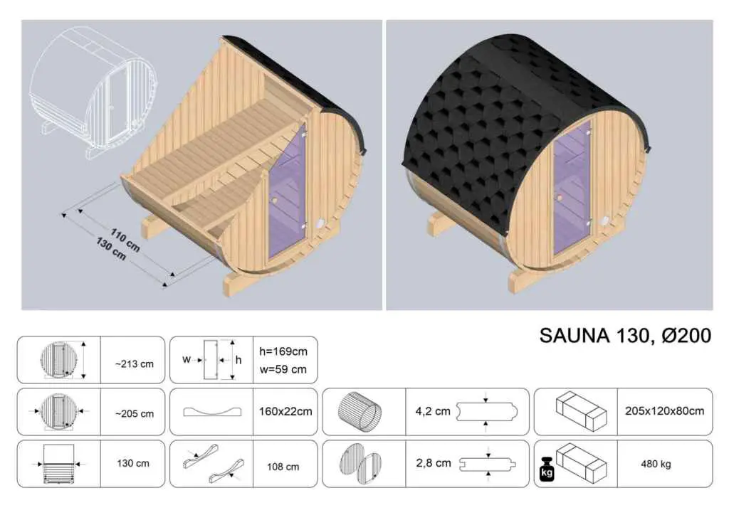 Manufactured sauna kits use 42mm (1-7/8″) logs for the barrel walls & 28mm (1-1/8″ logs for the end walls. Produced of Baltic Spruce, an ideal material for sauna’s. This model comes in a flat pack for easy transport and includes the following features: