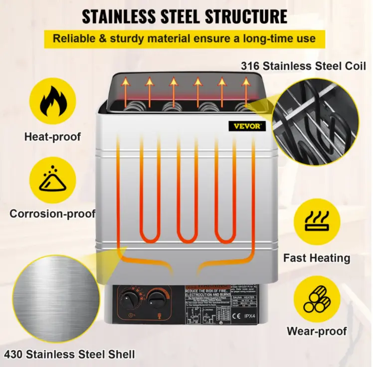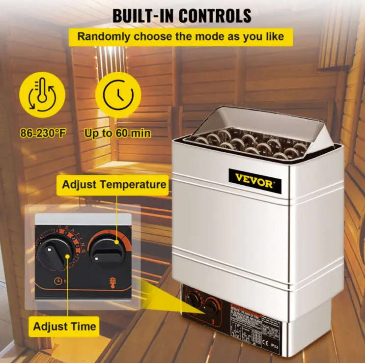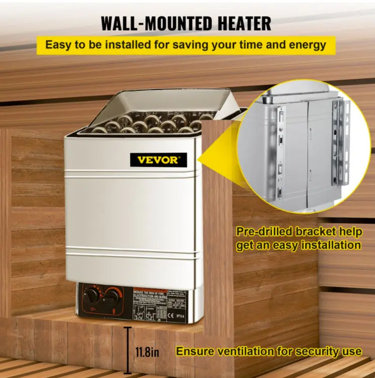 Heater: Vevor wall mount 6KW stove 220V-240V with internal controller. (sauna stones not included). Stainless steel, corrosion-proof, stainless steel heating coil, 86 degrees – 230 degrees F (30-110 C)