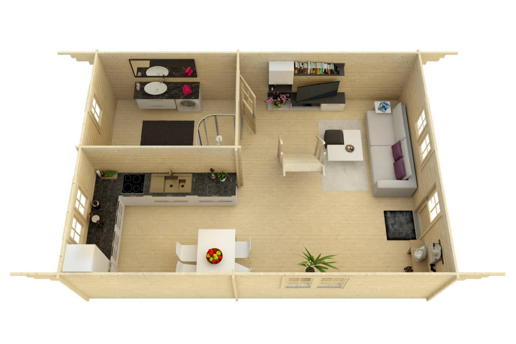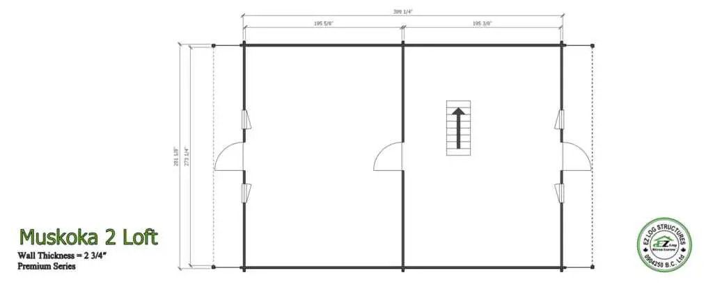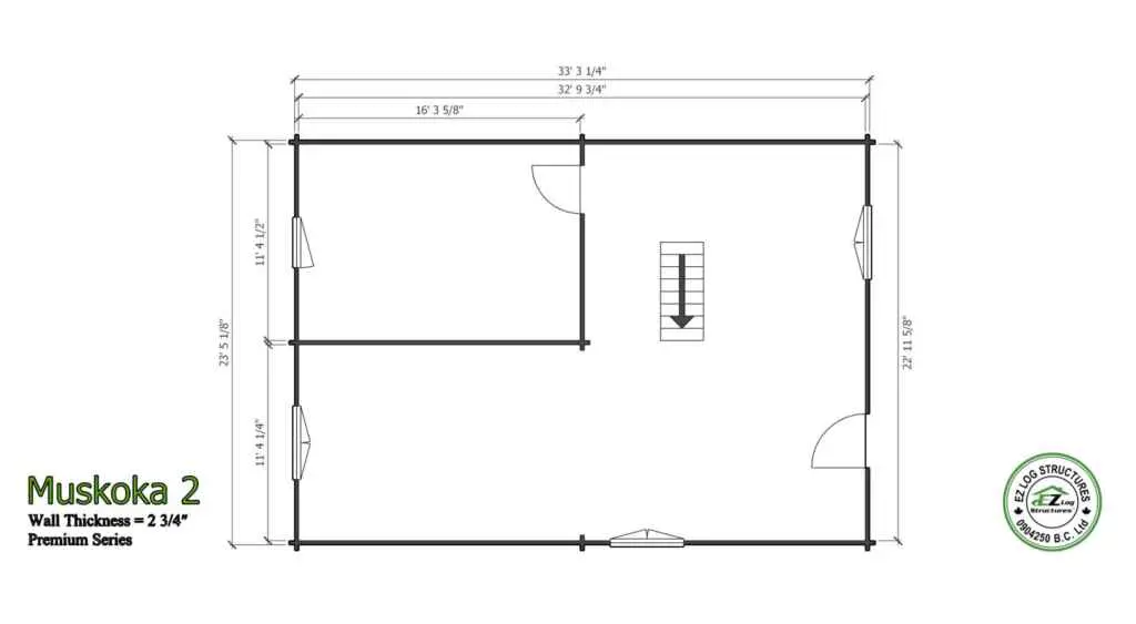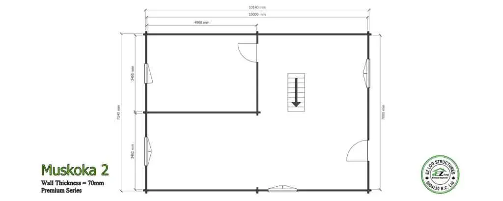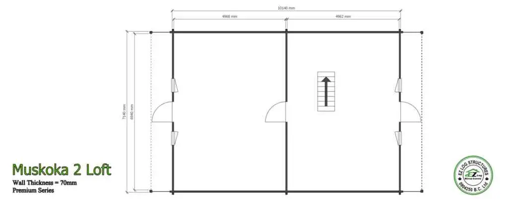 Muskoka 2 is a PREMIUM manufactured home with 70mm (2-3/4″) thick wall logs.  Just over 1540 sq’ total in 2 levels plus 2 decks on the upper floor. (sq footage is based the total footprint, living space could be less, see floor plans)